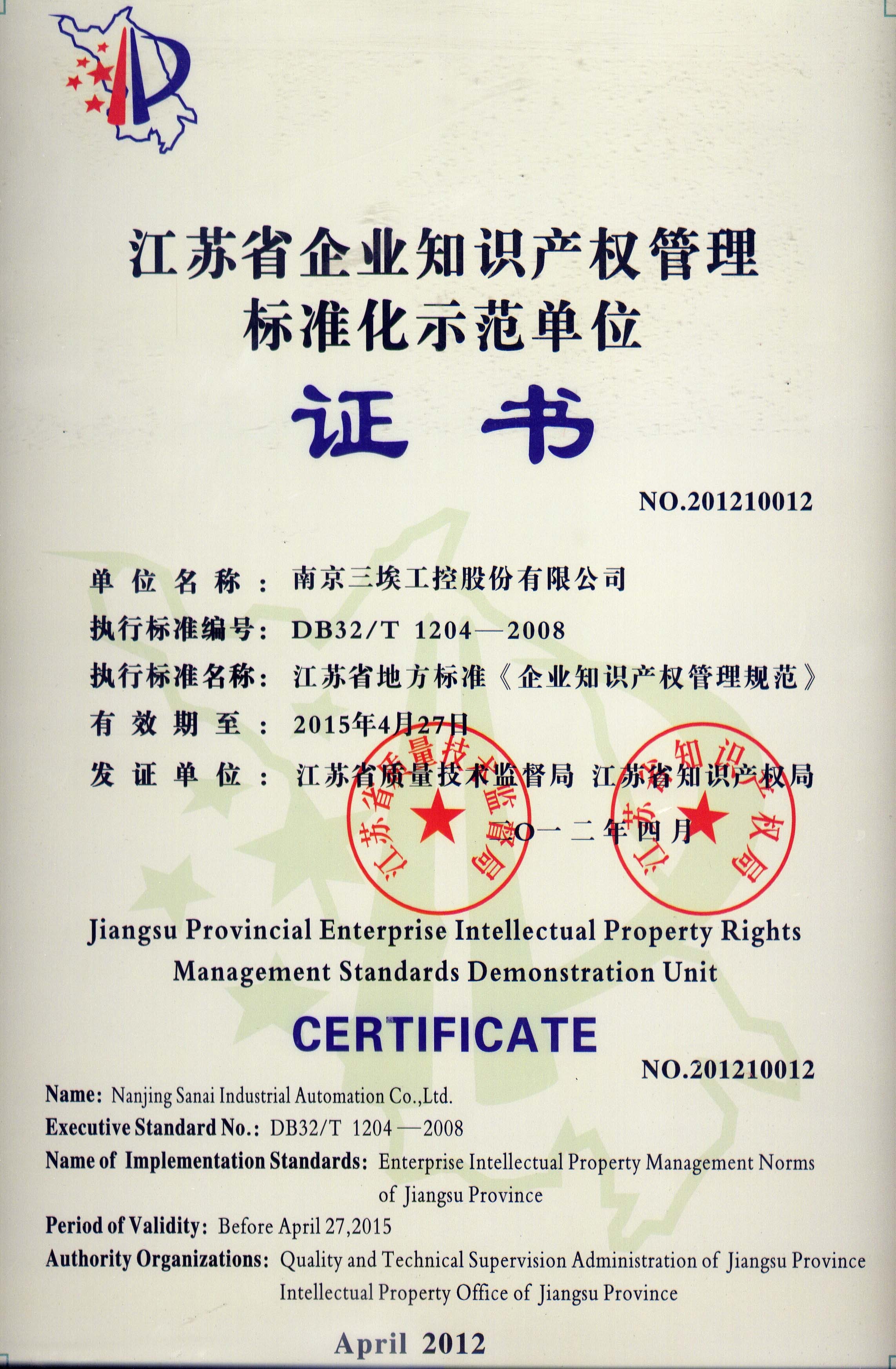 我公司获得省知识产权产权管理标准化单位证书