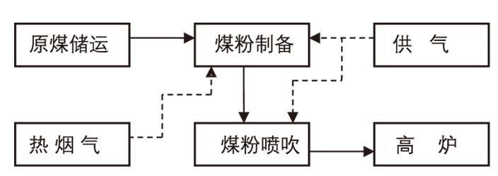 高炉喷煤就是把原煤(无烟煤、烟煤)经过烘干、磨细、收集,然后用压缩空气(或氮气)输送,通过喷煤枪从高炉风口直接喷入炉缸的生产工艺。高炉喷煤系统的工艺流程主要由原煤贮运、